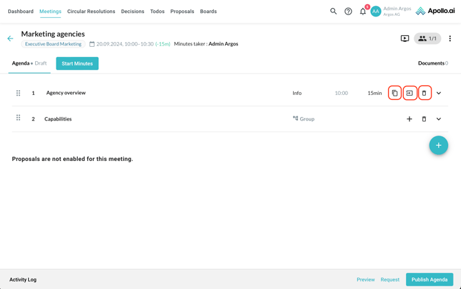 You can also duplicate an item, move it to another meeting, or delete it using the buttons on the right: