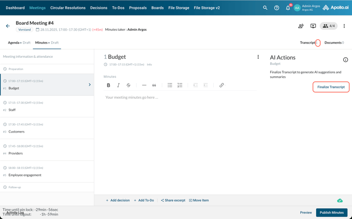 Once the transcript is ready, you see the number of the available transcripts (usually "1") next to the transcript icon and you can click on "Finalize transcript" on the right: