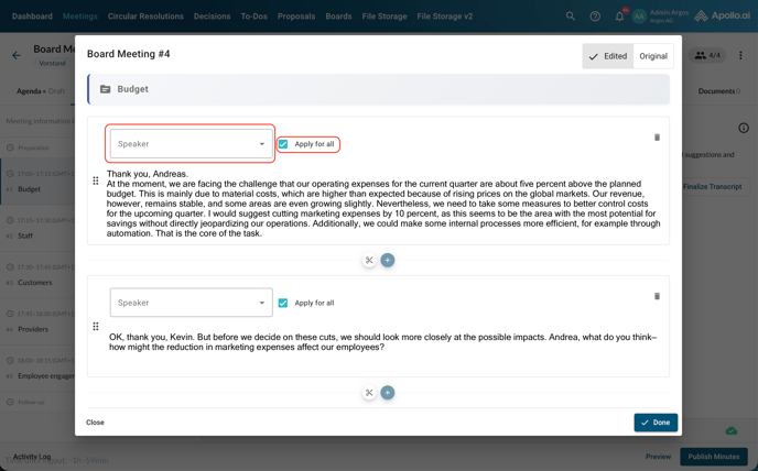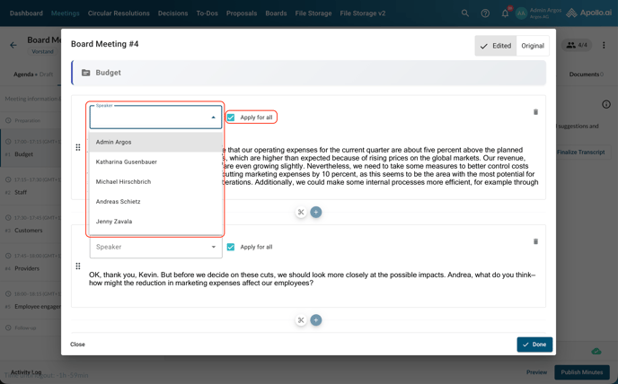 Select the correct participant from the drop-down menu for each entry. By default, all instances of that speaker are updated to the selected participant, however you can untick the box "Apply for all" on the right if you wish to change a speaker for one entry only, for example if a voice was incorrectly recognised for one entry only.
