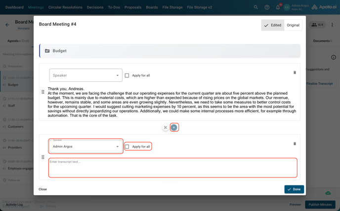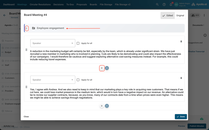 If you need to anticipate or postpone an agenda item, you can either drag & drop it using the six dots on the left of the item title or clicking on the scissors icon between two speaker items to make the current agenda item end at that point.