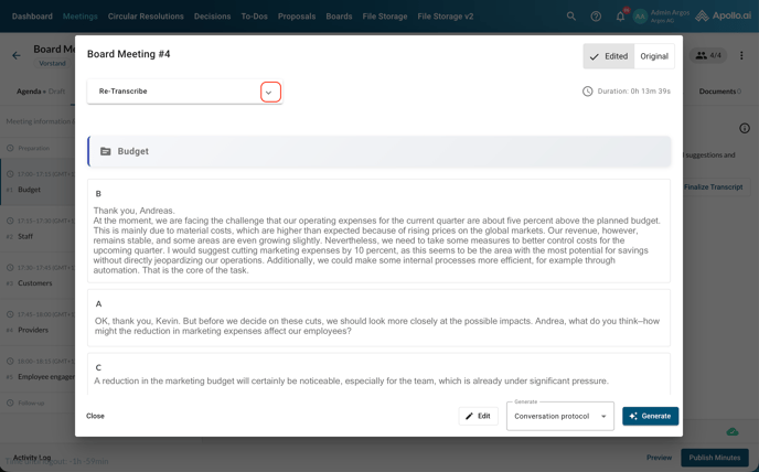 Note: If you re-transcribe the meeting, any previous edits will be  lost in the process.