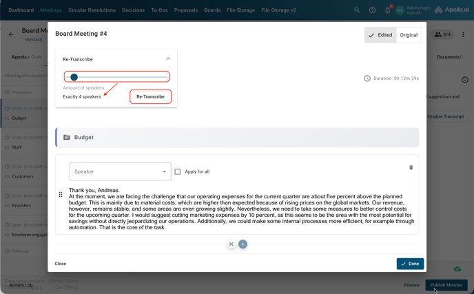 If at first glance the speaker recognition does not look quite right, this is usually due to the wrong amount of total speakers being indicated to the AI in the transcript settings. In fact, the voice recognition only works well if the AI knows how many speakers are going to be in the meeting – this is a technical requirement.