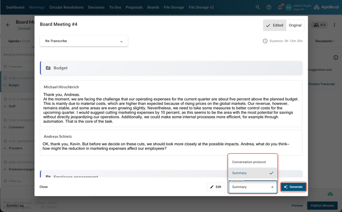 If you wish to create both a summary and a conversation protocol, simply come back to this step after the first round, select the other output type, and click on "Generate" again. The new output will be appended to the existing one and no suggestions will be overwritten.