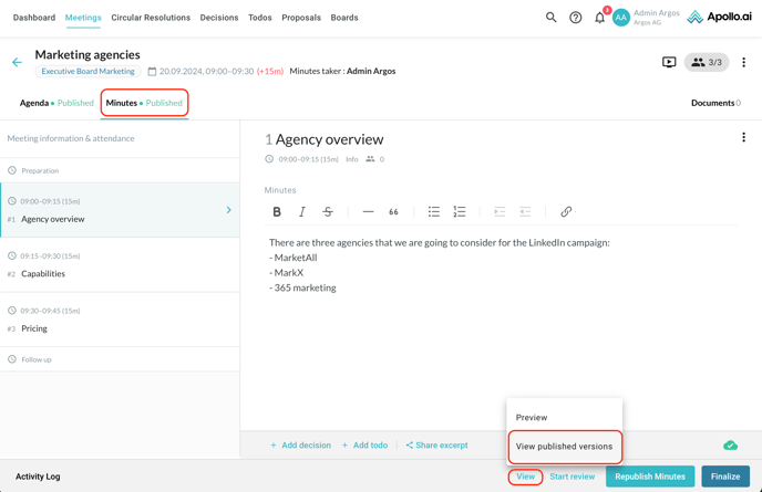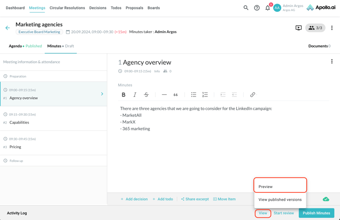 You can preview the meeting minutes before publishing them by clicking on the "View" button in the bottom-right corner, then on "Preview":