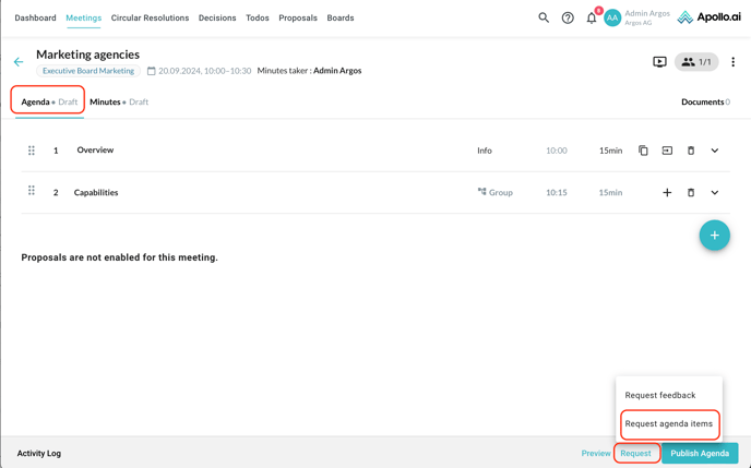 The process starts by opening a meeting for proposals by clicking on “Request agenda item” in the agenda editor: