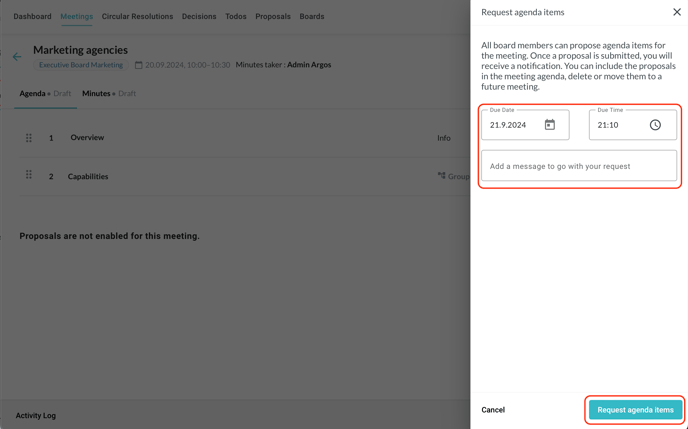 Set a deadline and add a message if desired, then click on "Request agenda items":