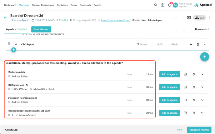 As a Board Organizer, you can request Board Members to propose agenda items for the upcoming meetings. The items proposed can either be added directly to a meeting by the responsible Board Member or be included in the proposal pool, which - provided the items are not time-critical - are dealt with in a later meeting as deemed appropriate by the Board Organizer.