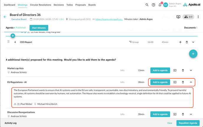 The proposal appears at the bottom of the respective agenda. In the middle you can see the item type and duration: