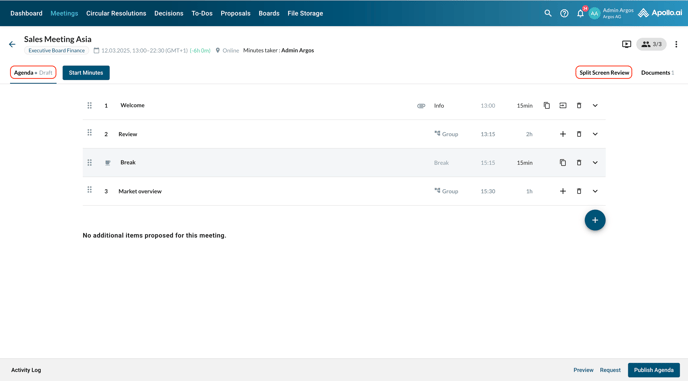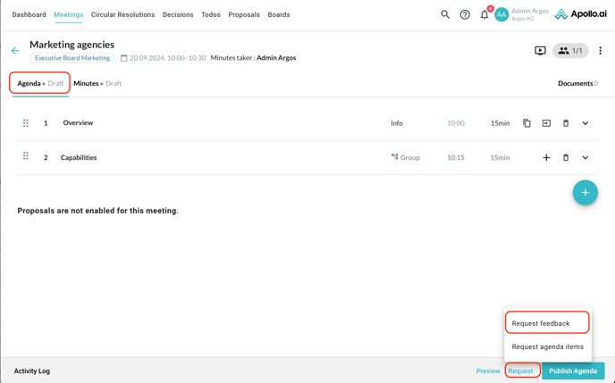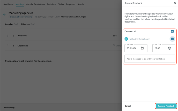 Select which Board Members should review the agenda, set a deadline, add a message if desired and confirm the request by clicking on "Request feedback" in the bottom-right corner: