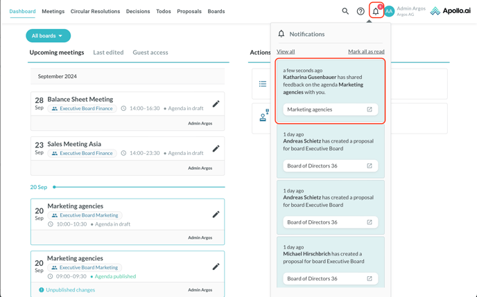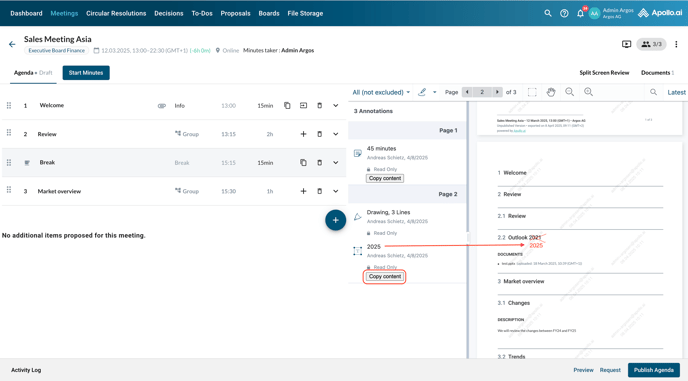 Click on the notification to get redirected to the agenda editor and select "Split screen review" in the top-right corner to view the annotations: