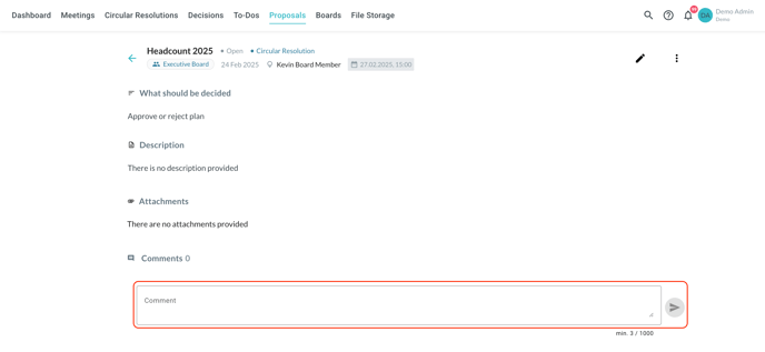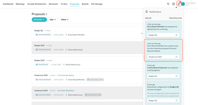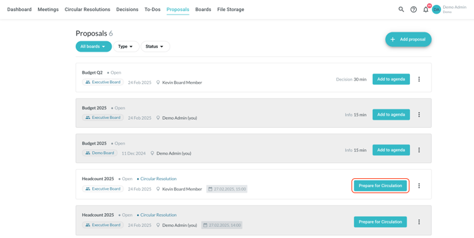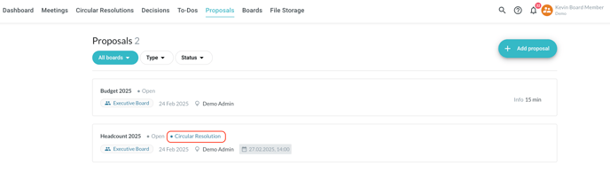 In the overview in the 'Proposals' tab, circular resolution proposals are marked accordingly in order to differentiate them from agenda item proposals: