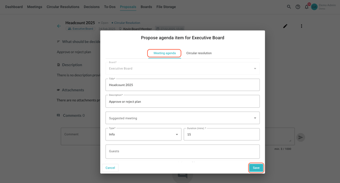 To convert a circular resolution proposal into an agenda item proposal, switch to the 'Meeting agenda' tab at the top of the form, carry out the necessary changes and save. All the details are carried over automatically: