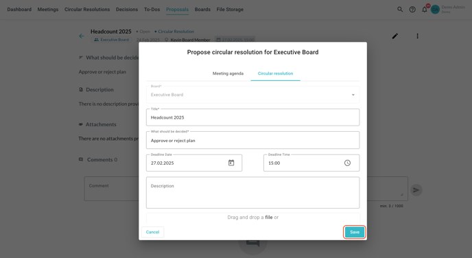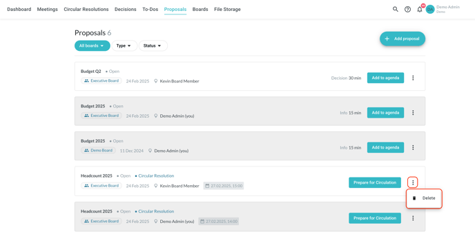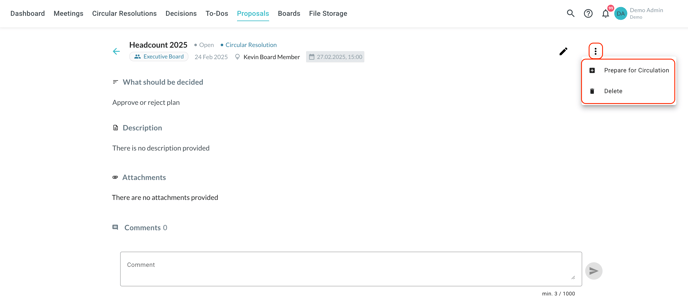 When reviewing a circular resolution proposal, you can use the three-dot button in the top-right corner to either prepare it for circulation (simply confirm the conversion to circular resolution in the pop-up window) or delete it if not suitable: