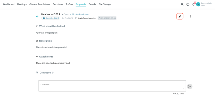 Click on the 'Edit' symbol in the top-right corner to edit the details of the proposal: