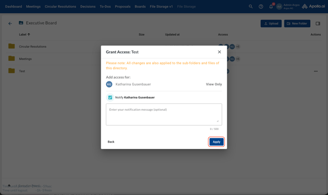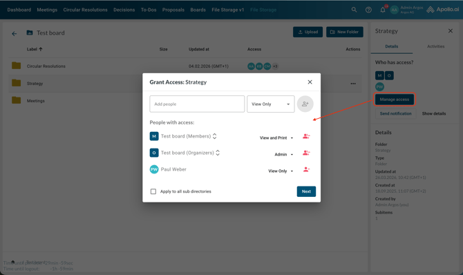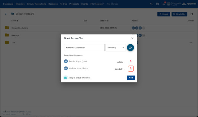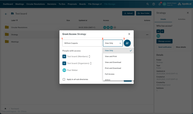 Note: In order to be able to select a user to add to a file or folder, this user must be added to the corresponding parent folder first at the board level (board folder).