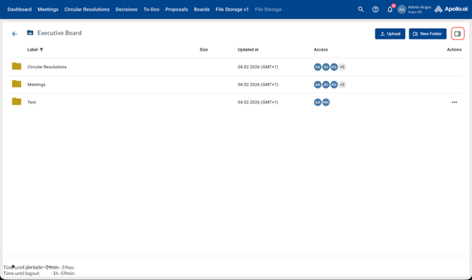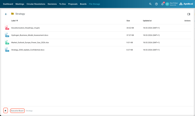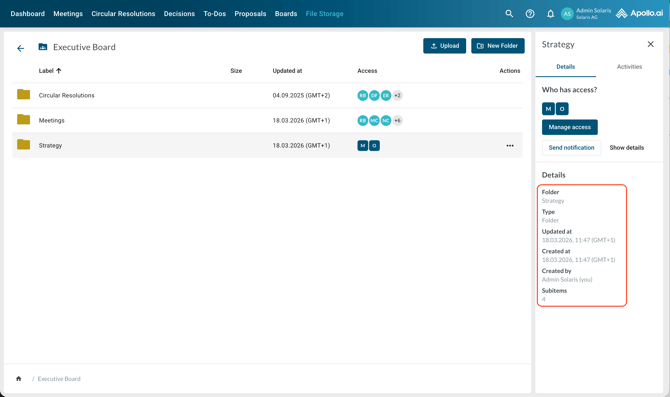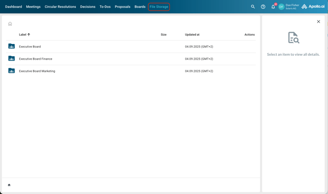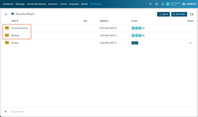 Open the desired board folder (double click). The 'Meetings' and 'Circular resolutions' folders are created and maintained by the system for every board. They include the related system-generated PDFs and any uploaded attachments: