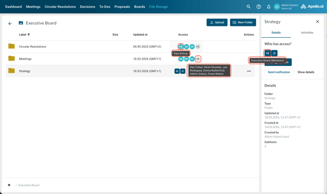 Hover with the mouse on a user, board, or group name to see the full names of the users, boards, or groups who have access to the selected file or folder (individual users are displayed as circles, whereas groups and boards are displayed as squares):