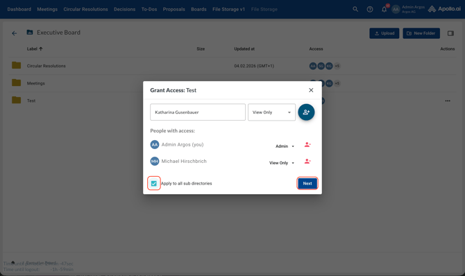 Define whether the access rights changes should apply to all sub-directories as well (if any), then click on 'Next':