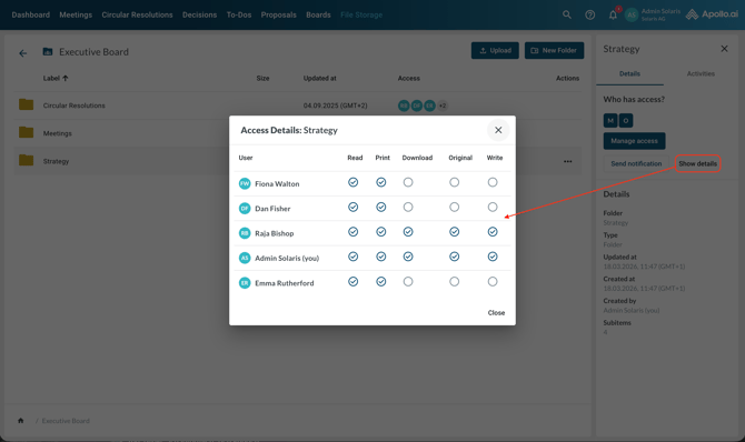 With an item selected, click on 'Show details' in the sidebar to display the current access rights: