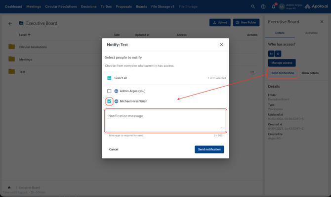 With an item selected, click on 'Send notification' in the sidebar to send a link to the item to one or more users who already have access to it. Select the user whom you want to notify, then add a notification message: