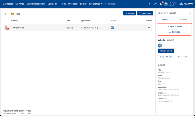 Double-click on files or folders to open them. When a file is already selected, you can also use the buttons in the sidebar to open or download it:
