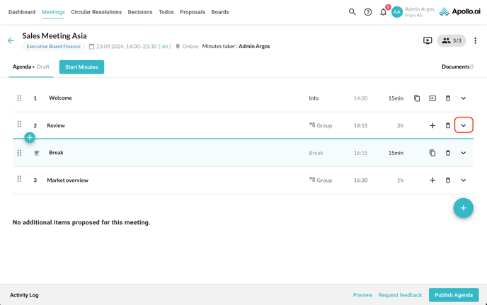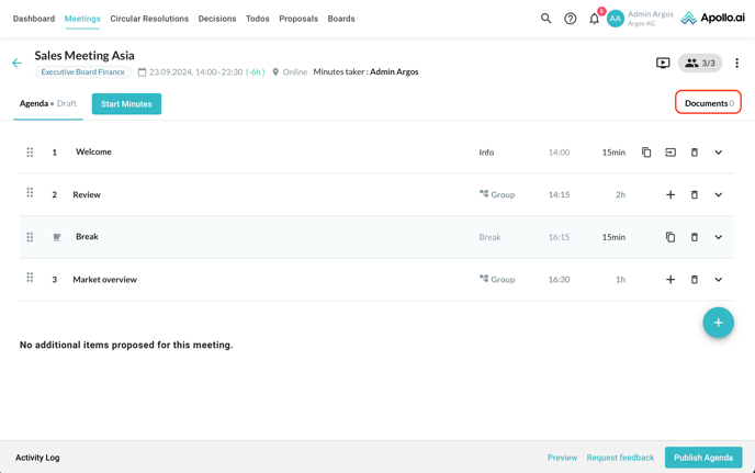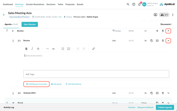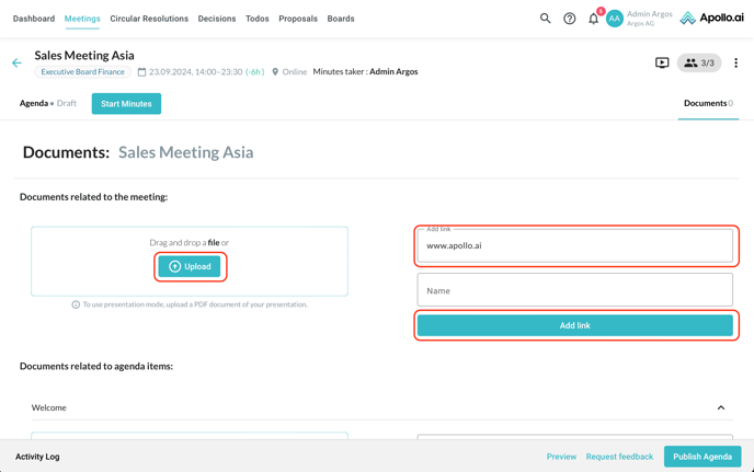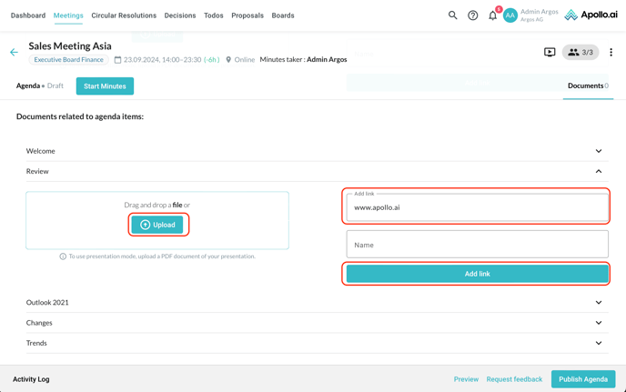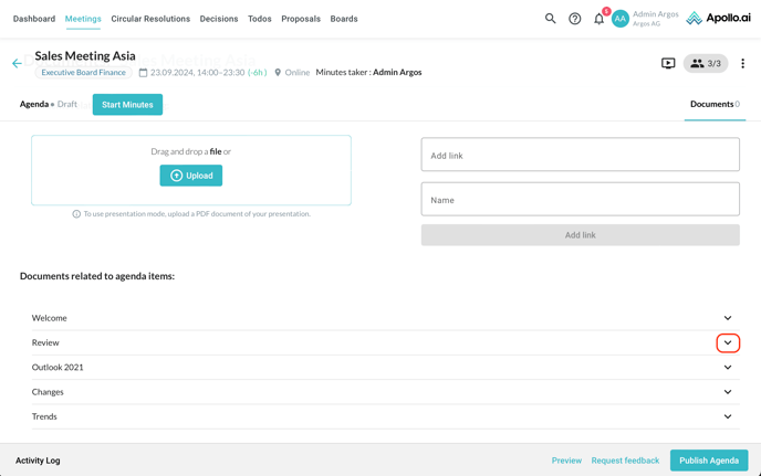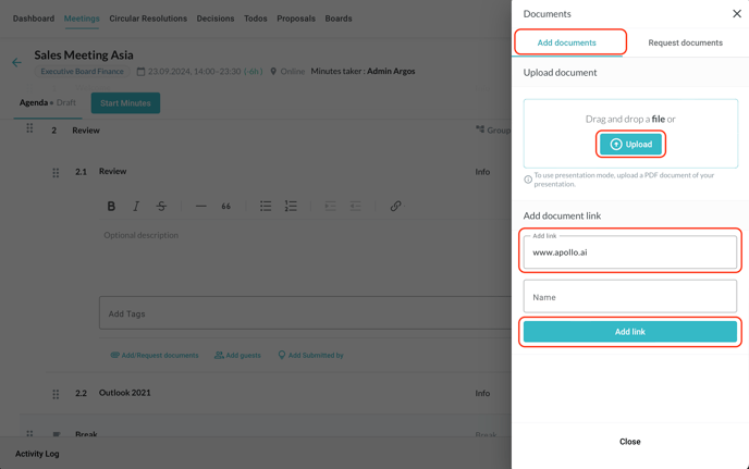 Another option is to open the specific agenda item from the agenda view and to add documents there: