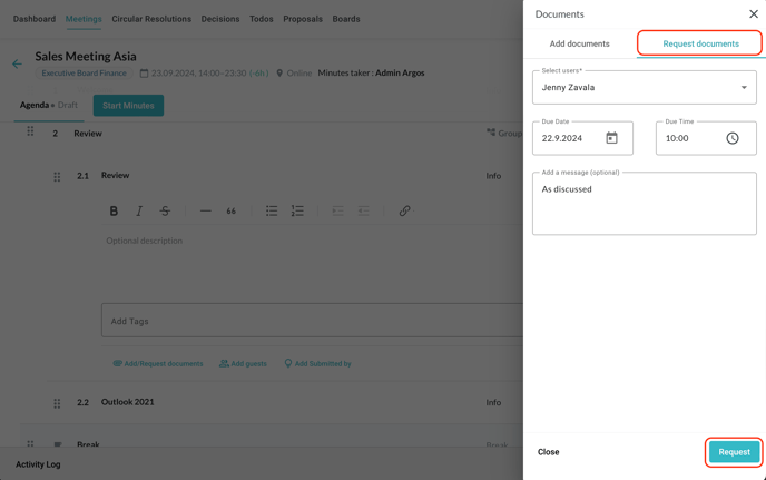 Alternatively, you can request a user to add the necessary documents instead. Select the desired user, then add a due date & time and a message if needed: