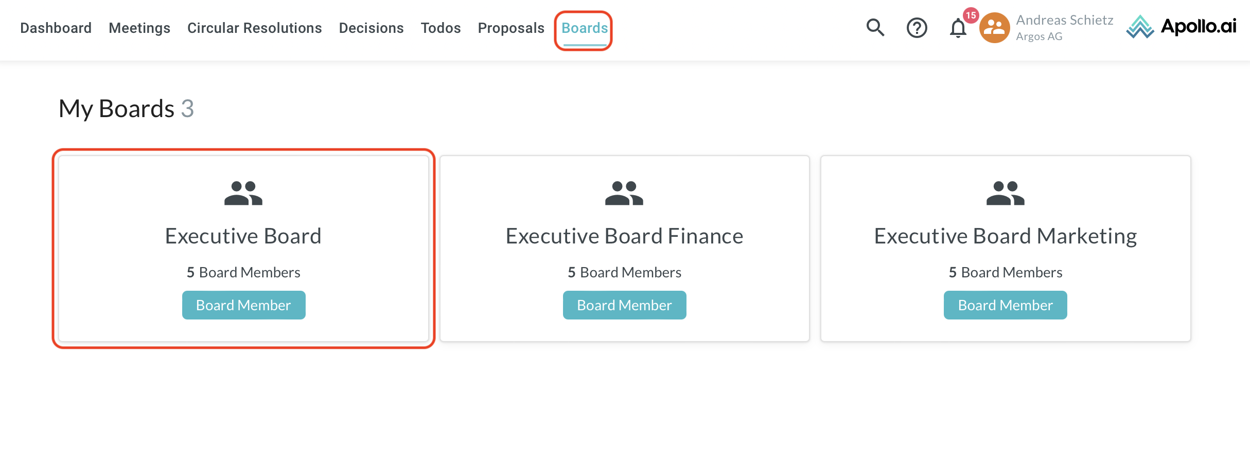 Go to the "Boards" tab. You will see all the boards you are a member of, the total number of board members by board, and your role within each board. Select a board from the overview: