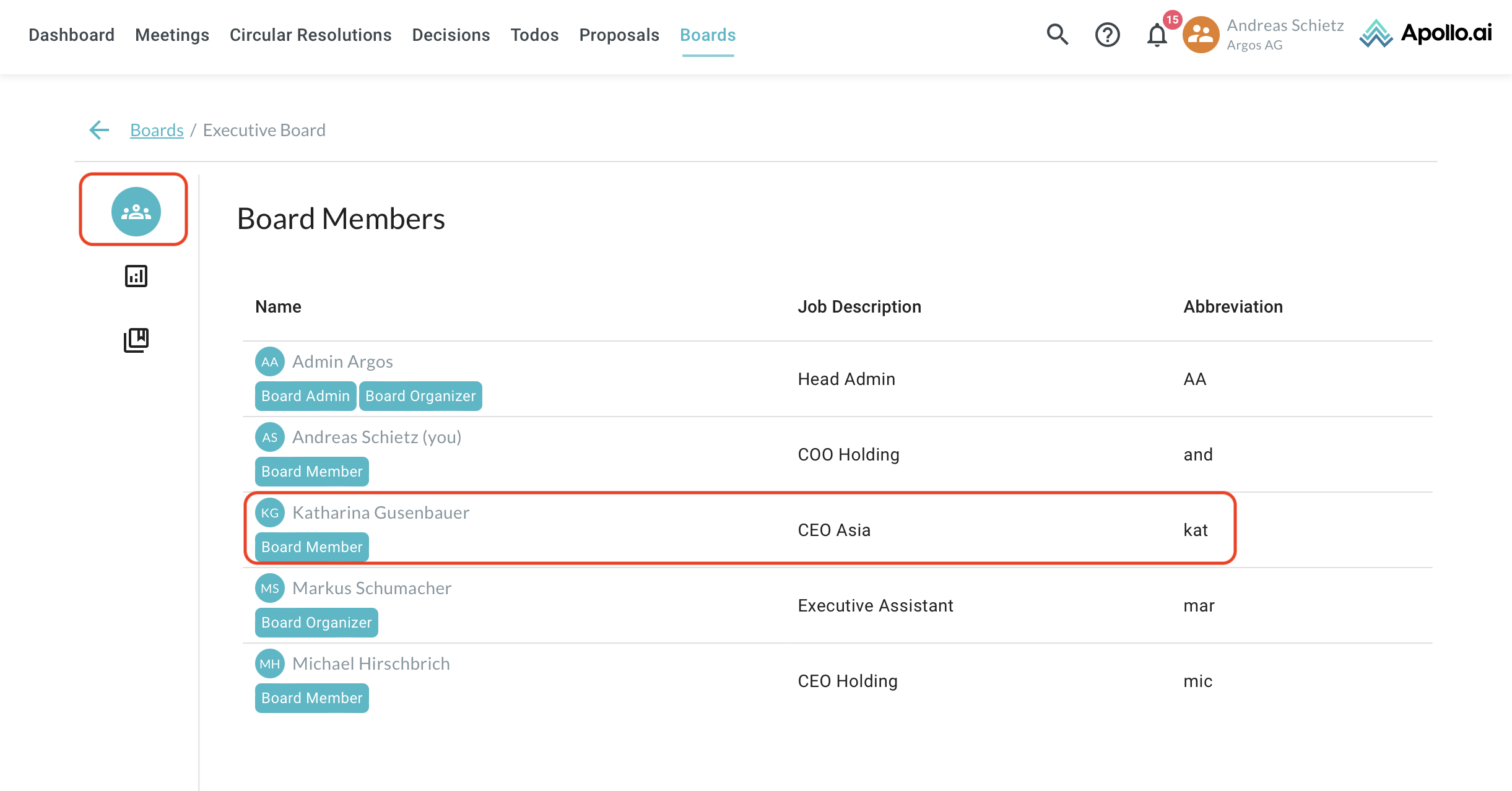 In the "Board Members" section, you can see all the board members, their job descriptions, and their nicknames if any: