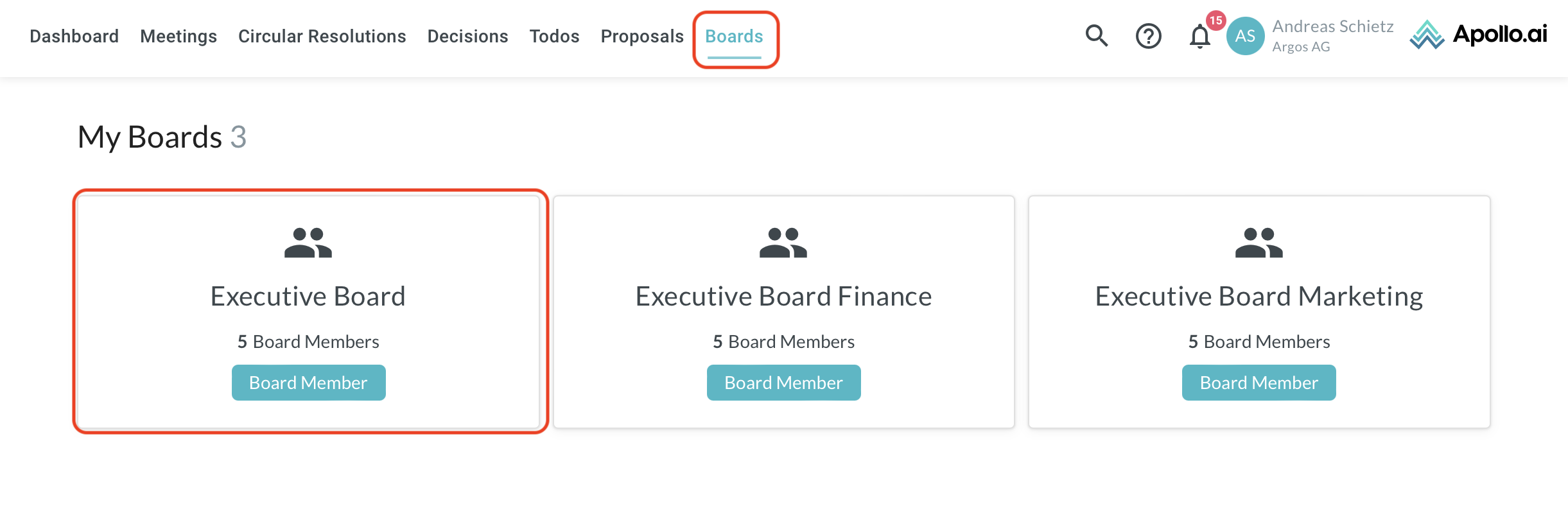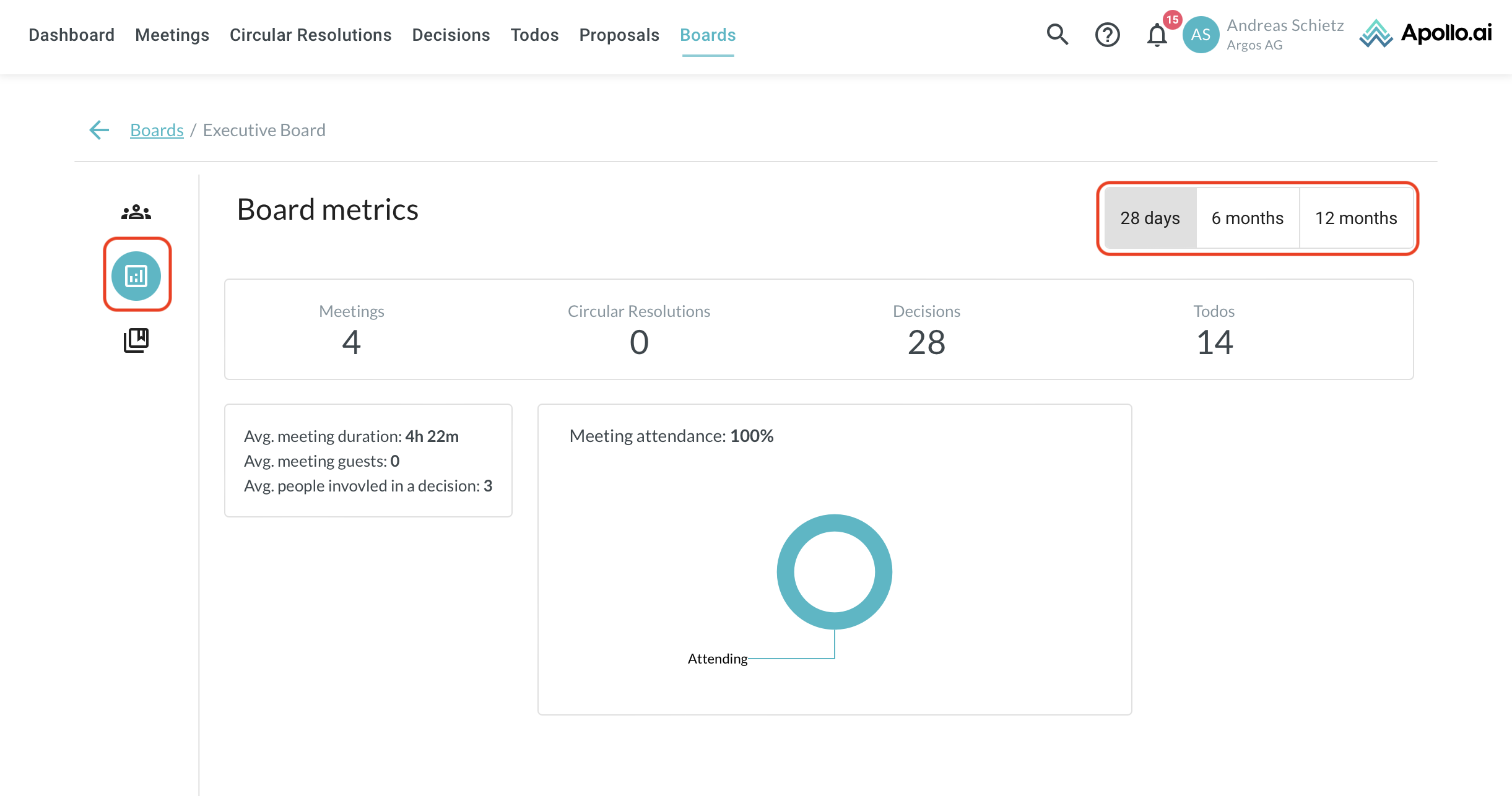 Navigate to the "Board metrics" page in the left column. You can now view the total meetings, circular resolutions, decisions, and to-dos for the selected board, as well as insights like the average meeting duration, guests, number of users involved in a decisions, and attendance rate. Use the filters at the top to change the data timeframe as desired: