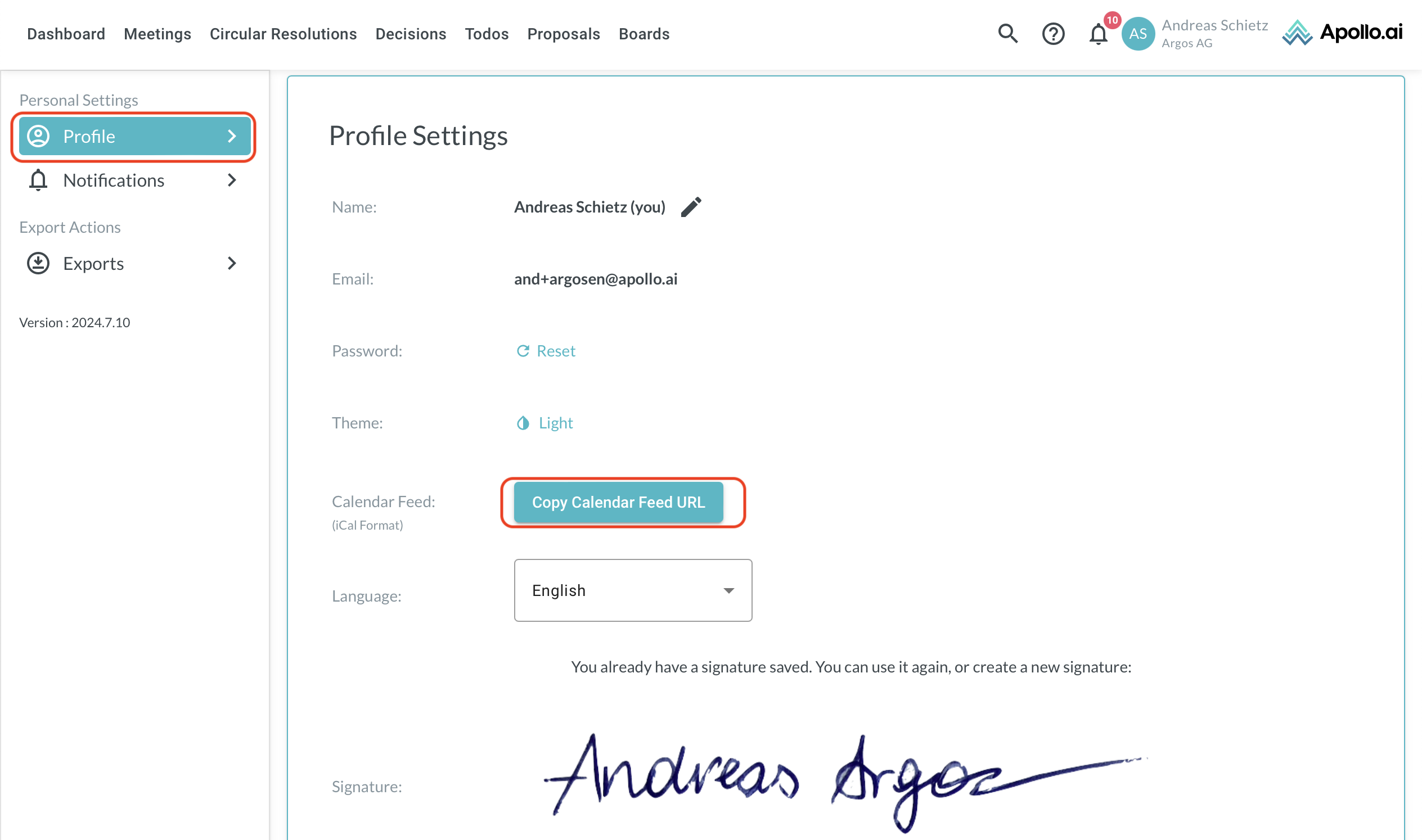 The URL is now copied to your clipboard and you can use it to add the Apollo.ai calendar to your personal calendar. The exact process depends on the respective calendar application (Google Calendar, Microsoft Outlook, ...).