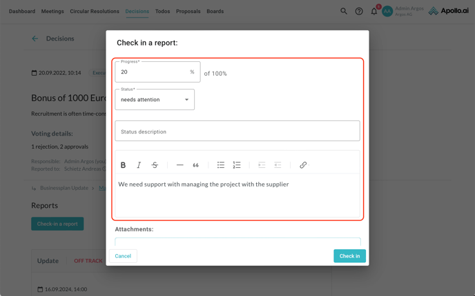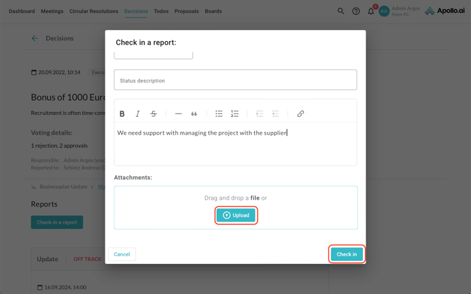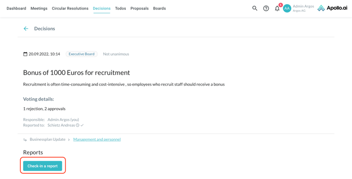 To submit a report for a decision, open the decision and click on the "Check in a report" button: