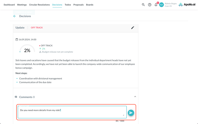 You and the assigned board member who receives the report can exchange comments directly on the decision by scrolling to the bottom part: