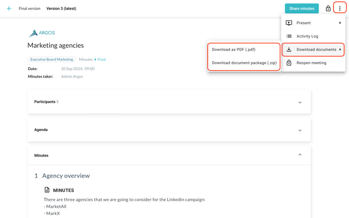 Open a meeting, then click on the three dots in the top-right corner. Select "Download documents", then pick your preferred file format: