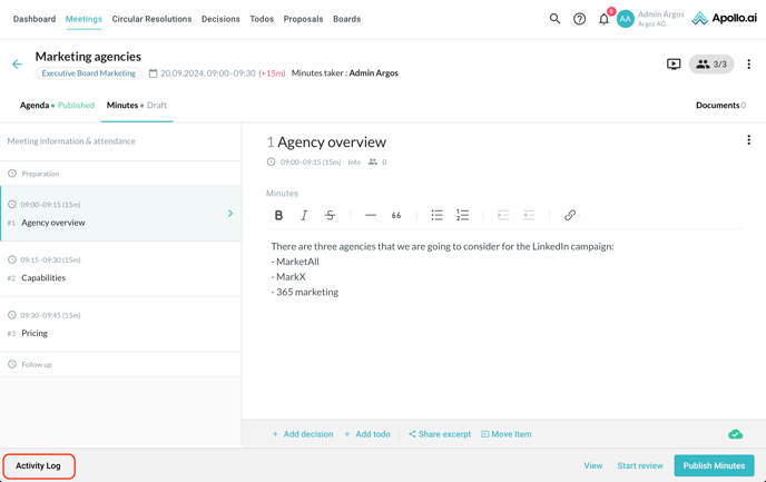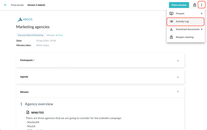 In the meeting activity log you can see who carried out any changes, at any time. Open a meeting and click on the symbol with the three dots in the top-right corner, then select "Activity log":