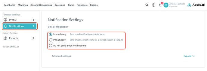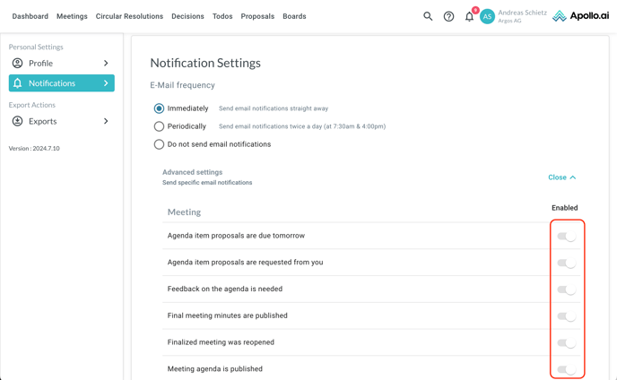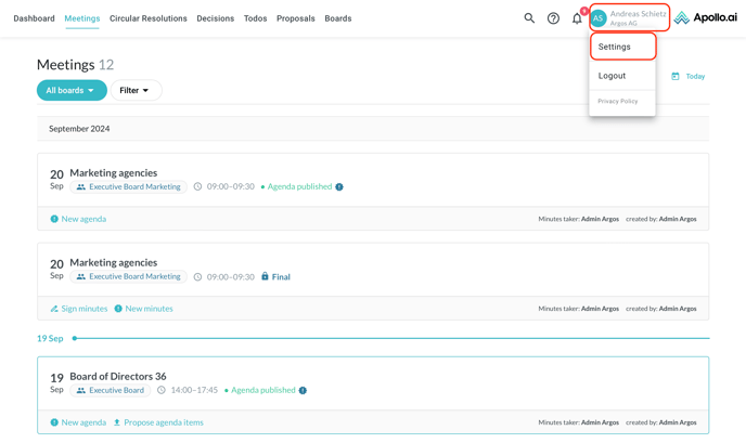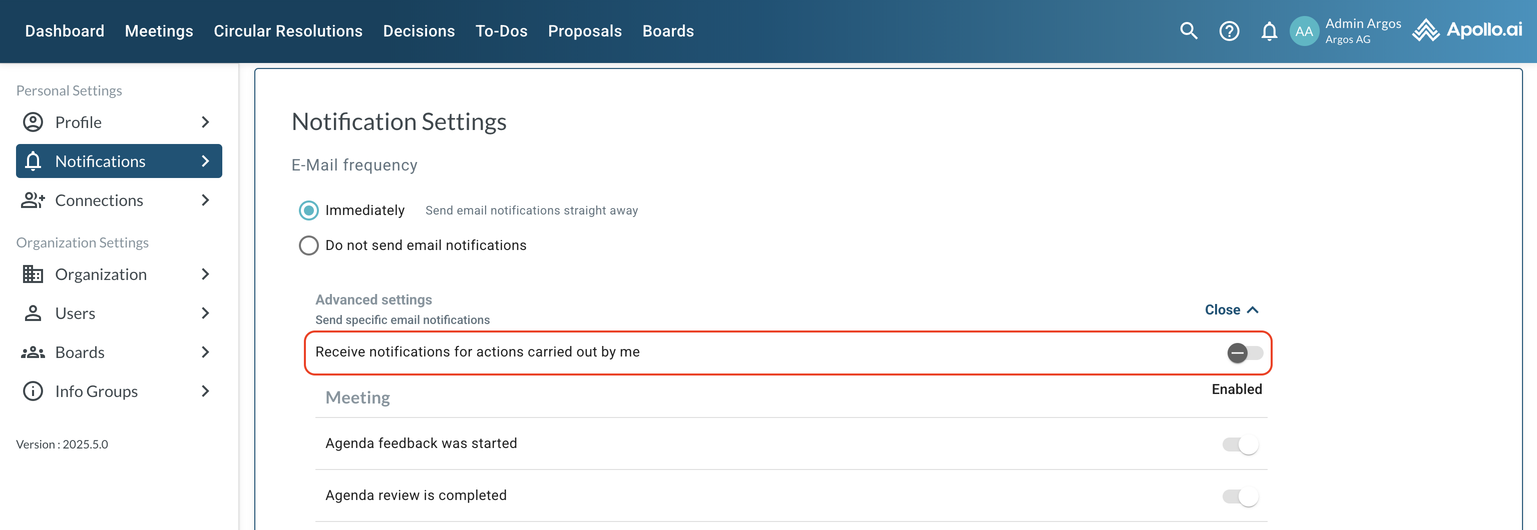 Activate the option 'Receive notifications for actions carried out by me' to receive email/system notifications triggered by your own actions, e.g. if you are a Board Organizer and publish an agenda: