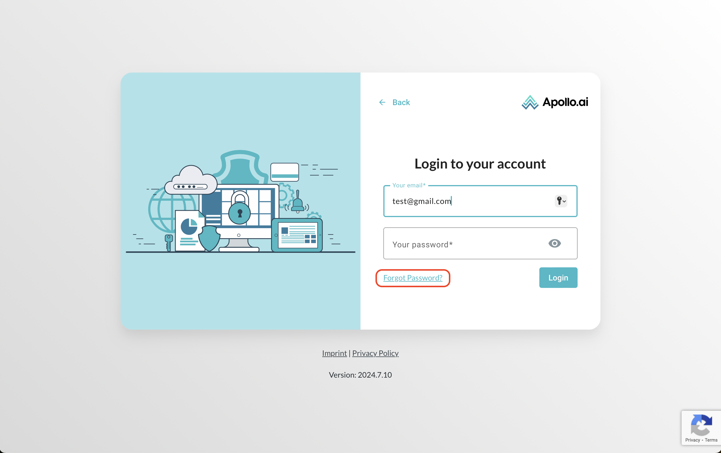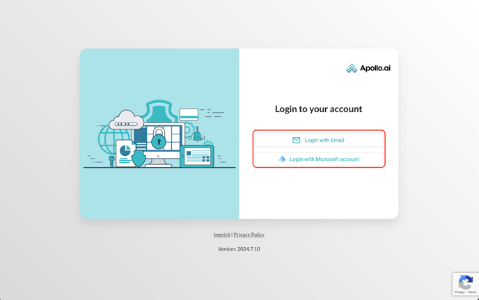 Follow the link app.apollo.ai to open the login page, then choose whether you would like to log in with your email address or with your Microsoft account:
