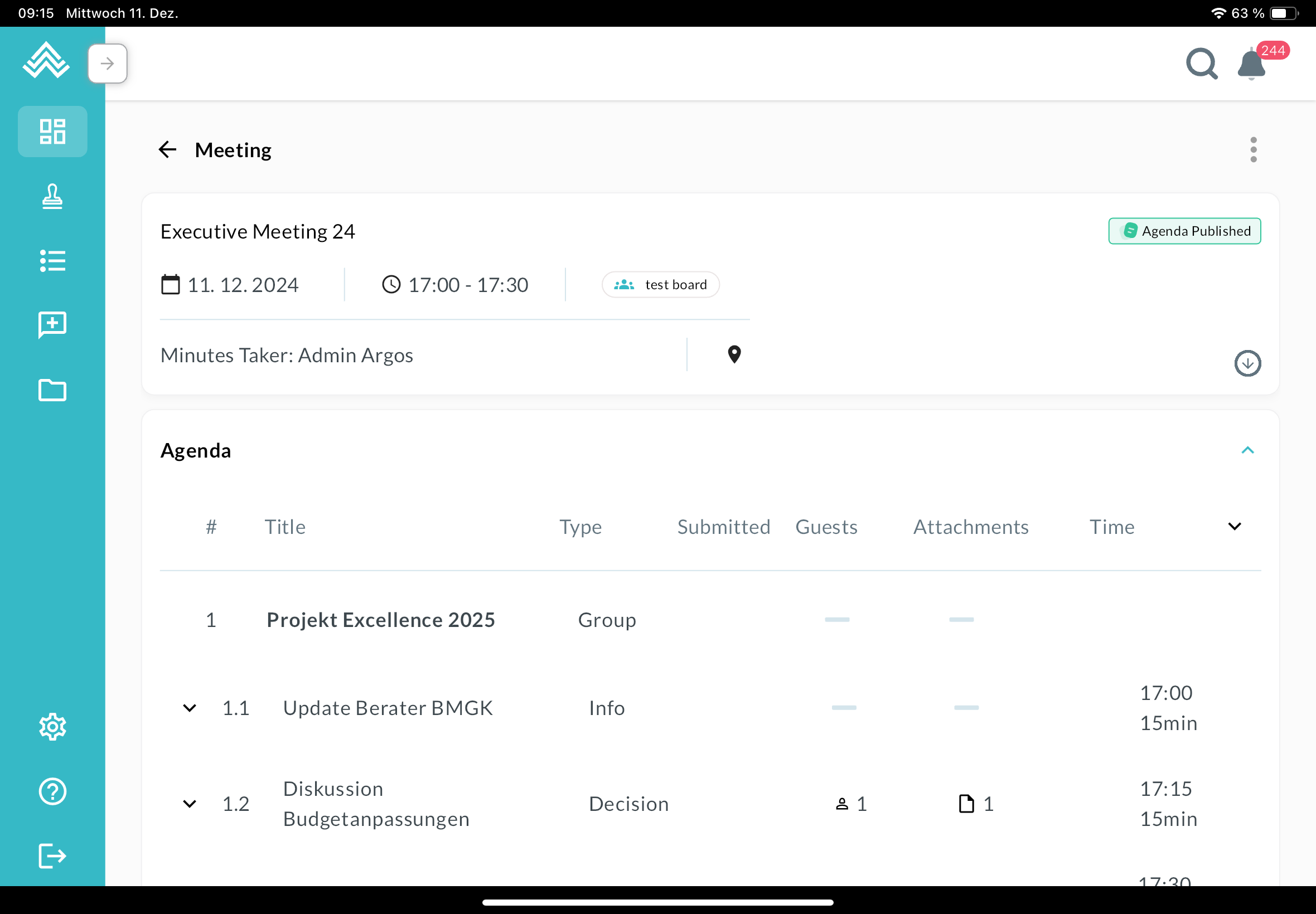 When opening a meeting, you can see the agenda, minutes, and attachments just like in the web version: