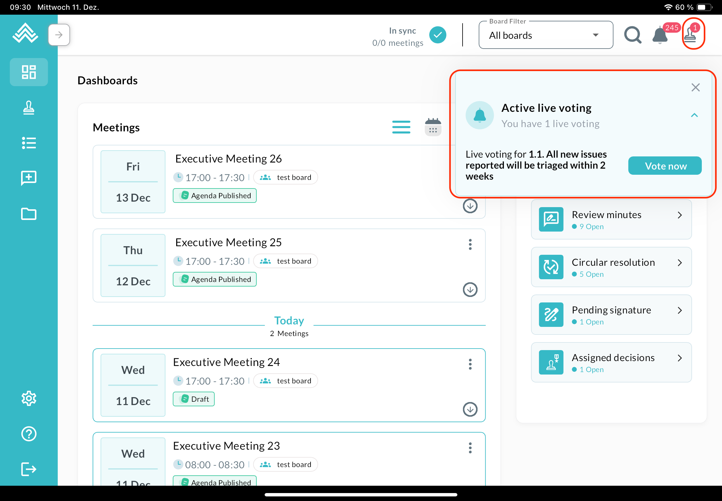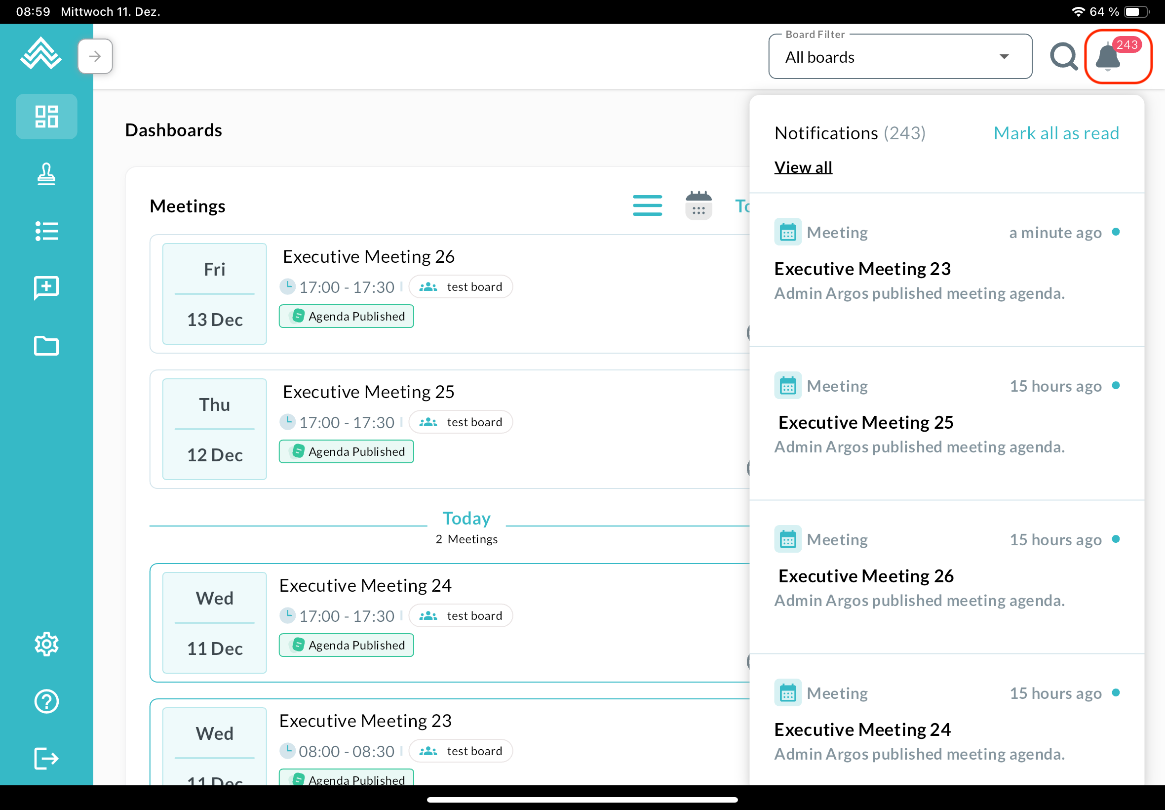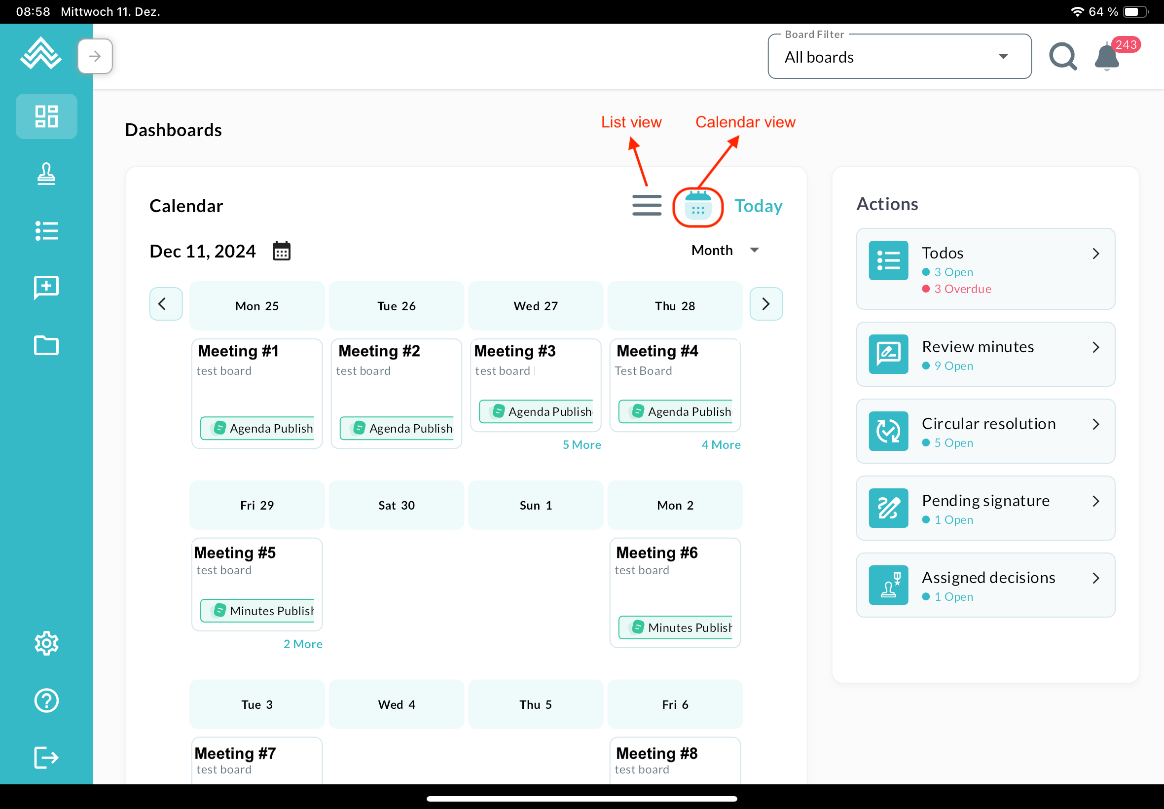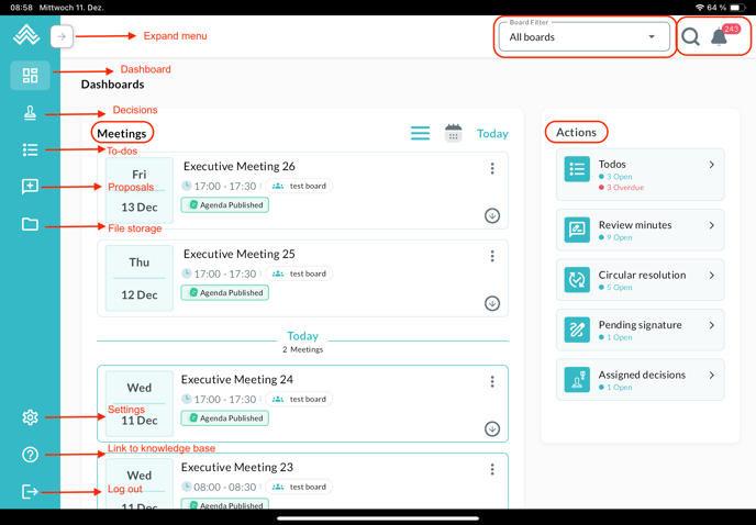 The dashboard reflects the one in the web app, with meetings on the left and actions on the right. The board filter can be found at the top, next to the search button and the notification icon. The menu on the left can be expanded: