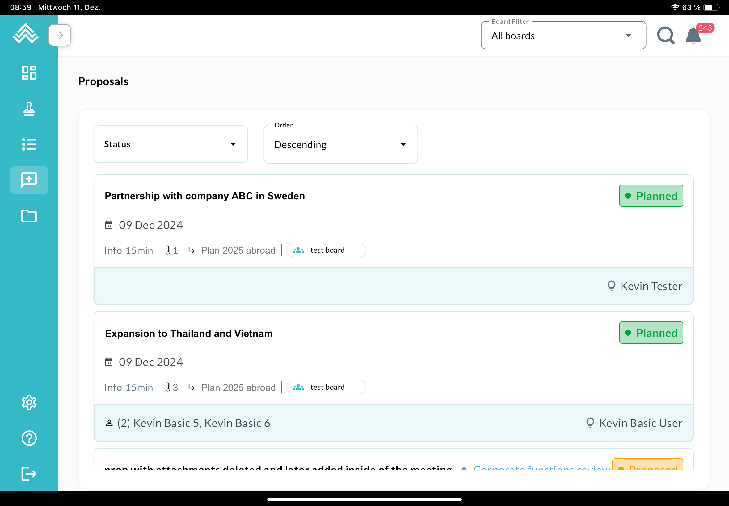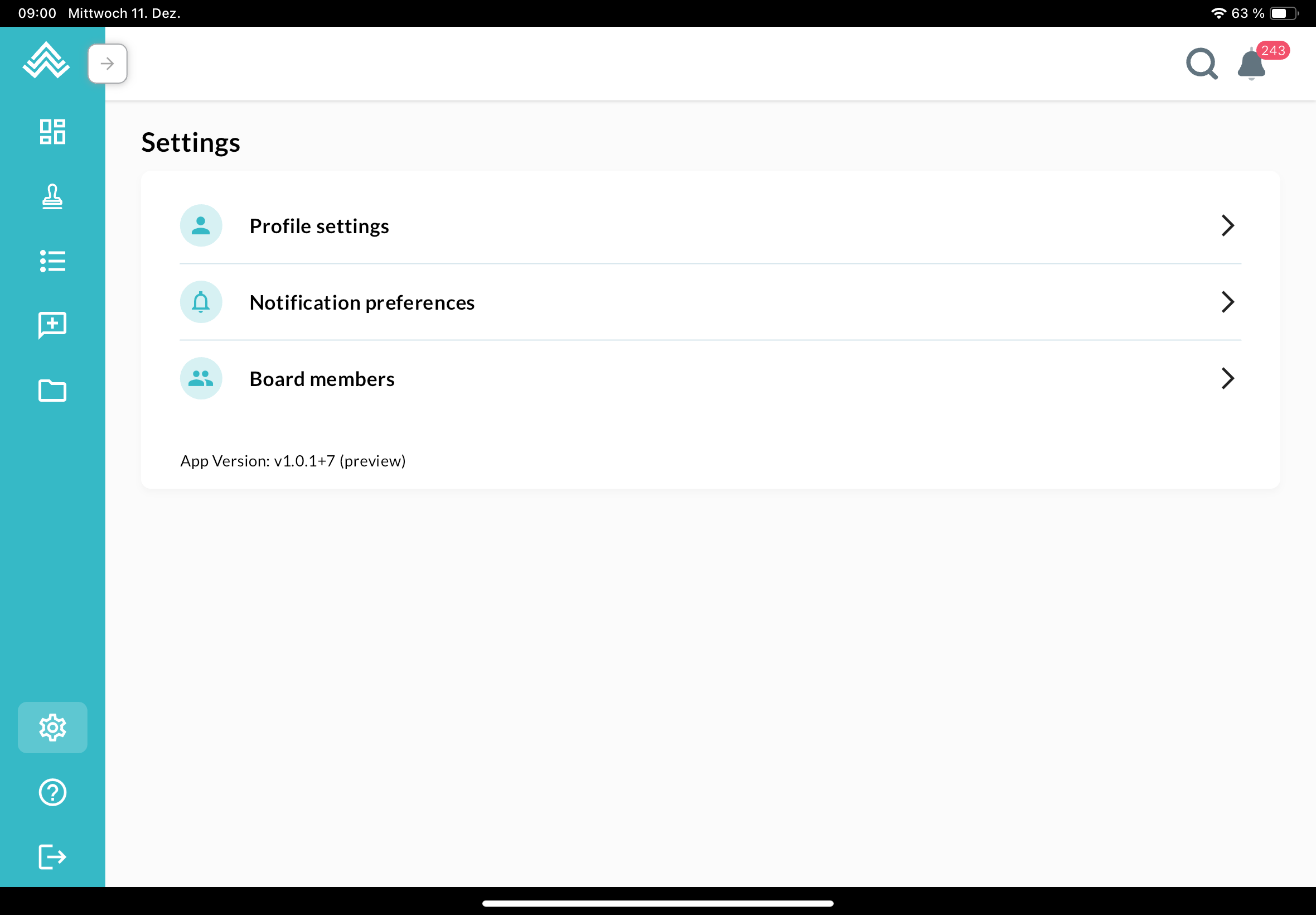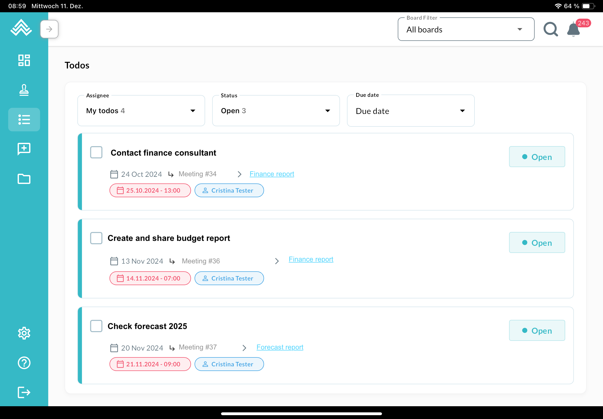 The dashboard reflects the one in the web app, with meetings on the left and actions on the right. The board filter can be found at the top, next to the search button and the notification icon. The menu on the left can be expanded:
