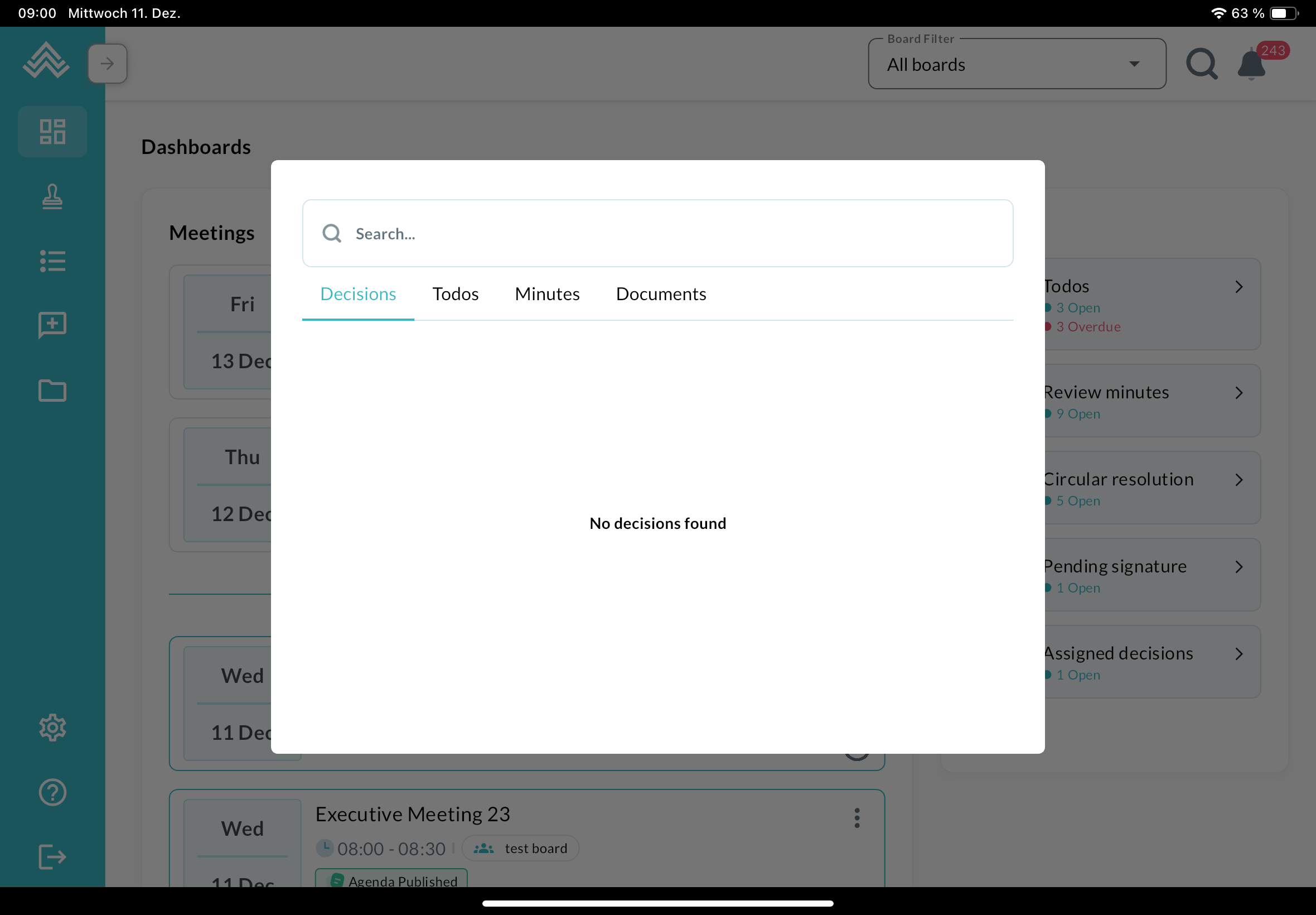 The search function works like in the web version – it shows results for decisions, to-dos, minutes, and documents separately: