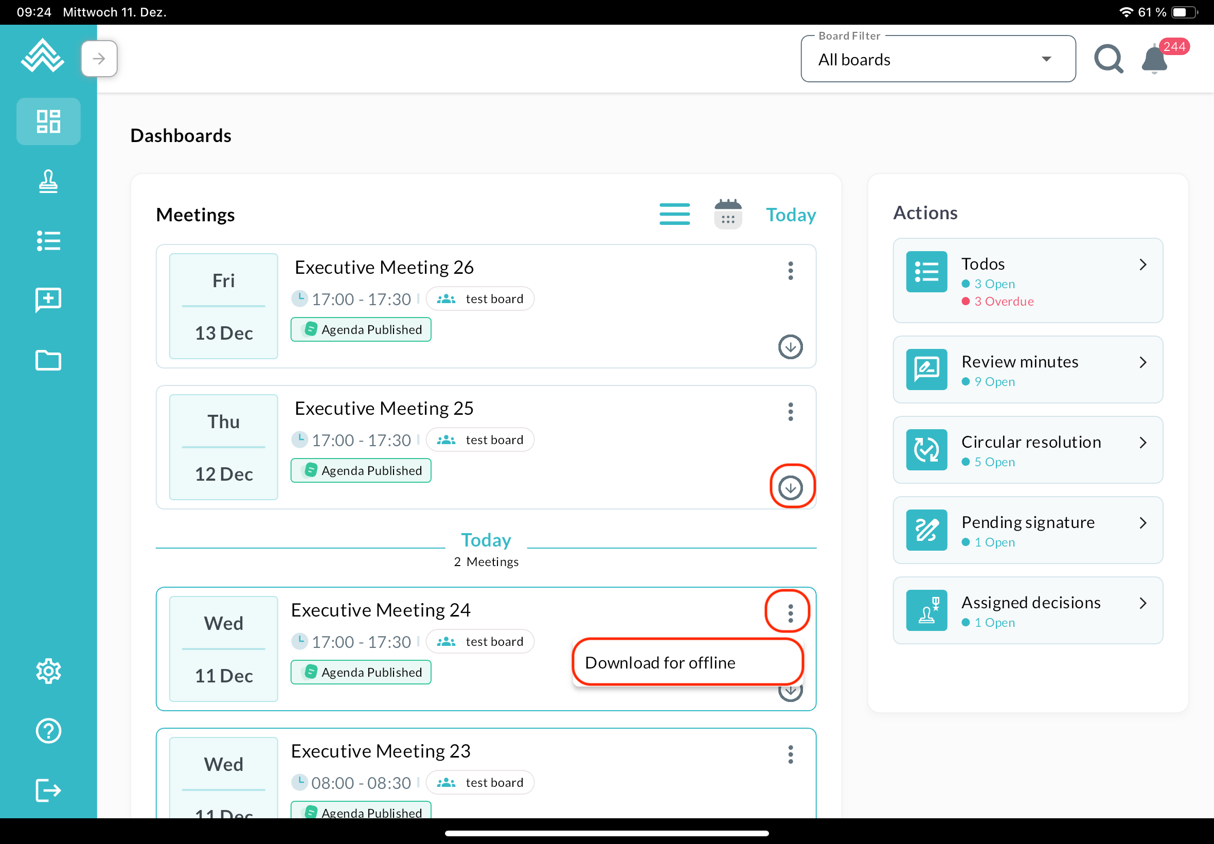 In addition, you can download one or more meetings to have them ready for review when you are offline (e.g. while flying), including all the attachments. Use the download symbol or the three-dot menu next to the meeting you wish to download: