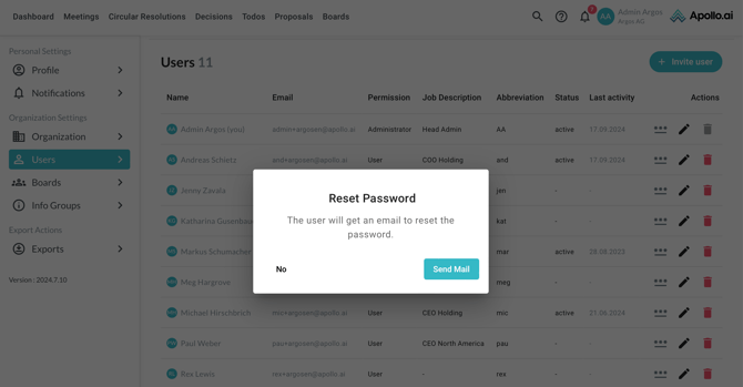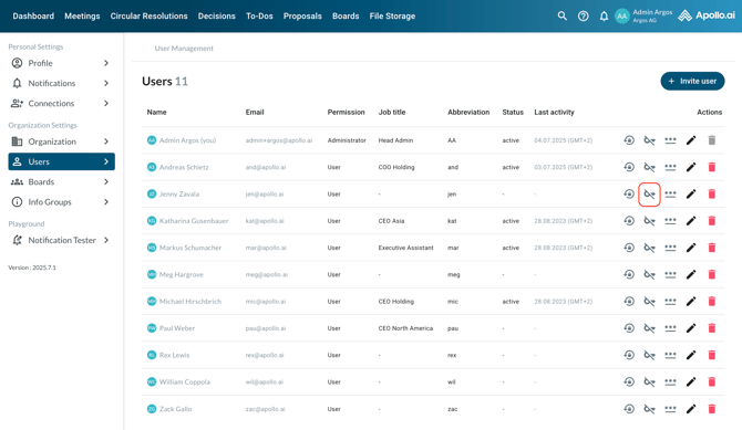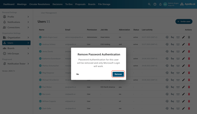 If your organisation logs in to Apollo via Microsoft SSO, you can also remove the email & password login for a selected user, so only the SSO login works for them. Click on the key symbol, then confirm the process by selecting 'Remove':