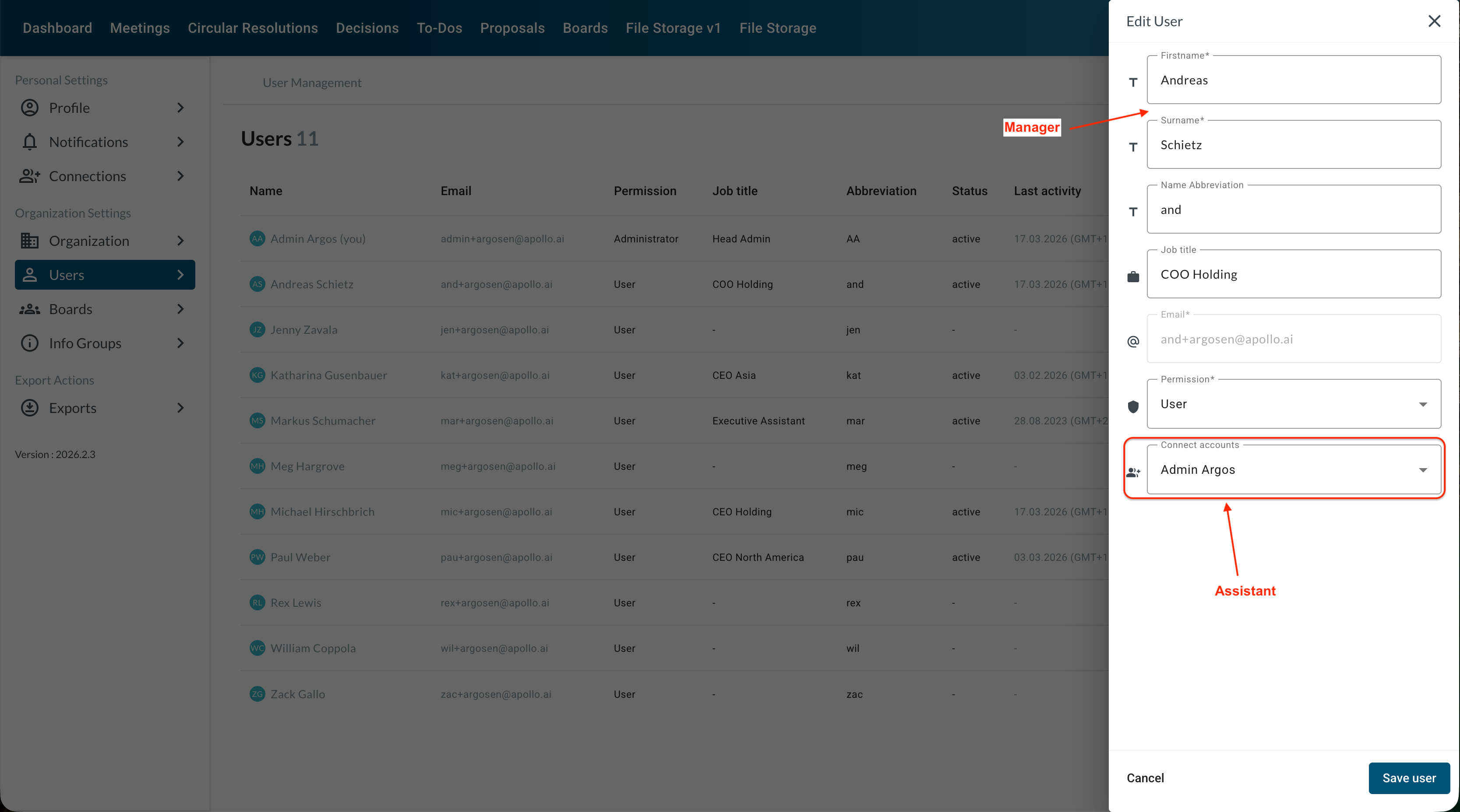 When editing a board member or basic user, you can connect their personal assistant to their profile: