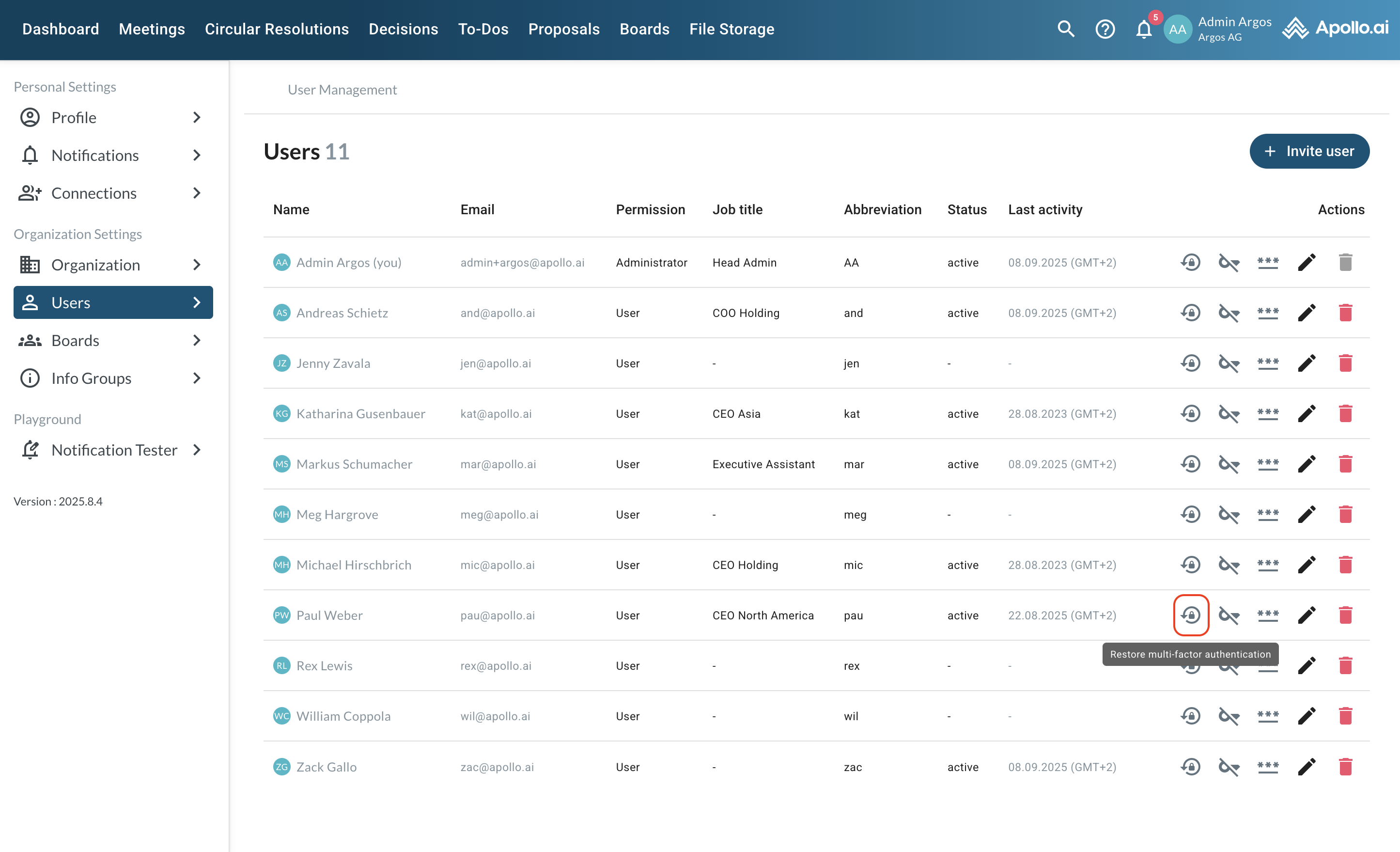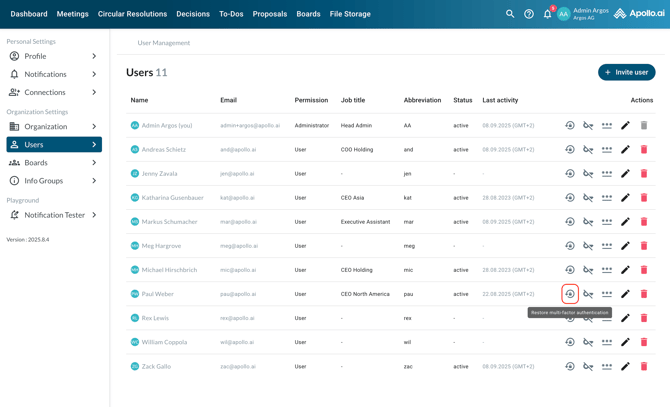 If your organisation uses 2-factor authentication, you can reset the 2-factor authentication key in case a user loses access to their current authenticator app and needs to scan the QR code again in order to add Apollo.ai to their new authenticator app: