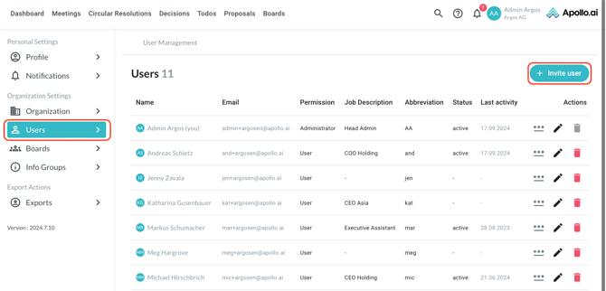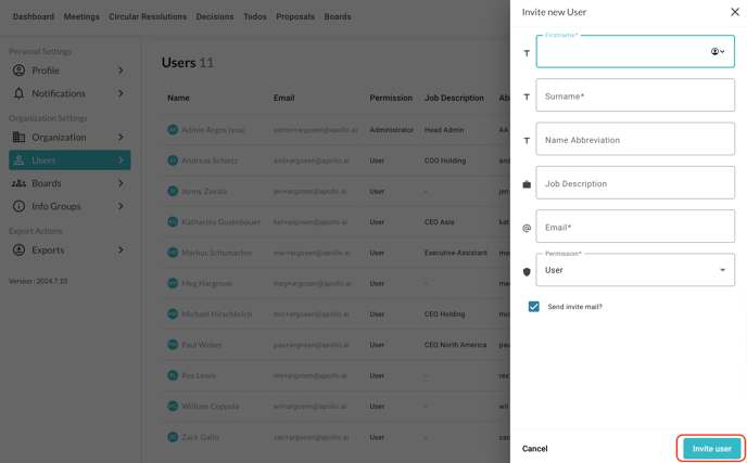 Fill out the form with the necessary data, then click on "Invite user" in the bottom-right corner: